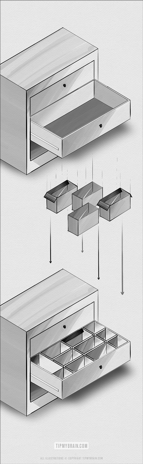Turn the drawer into a more useful space by using variously sized boxes divide the drawer into smaller sections. You stay more organized, your stuff takes up less room, and those re-used boxes will have a whole new life.